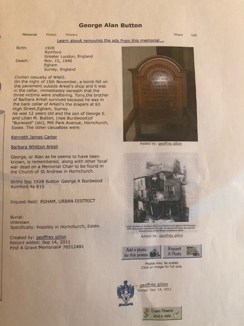 The lack of a headstone was made worse because the other boy killed in the bombing in November 1940 – George Button – also an evacuee – had a very distinctive memorial put up to him in St Andrew’s Church in Hornchurch in Essex after his body was returned home from Egham. And the girl killed on that fateful night Barbara Whitton Arkell was also given a proper resting place.