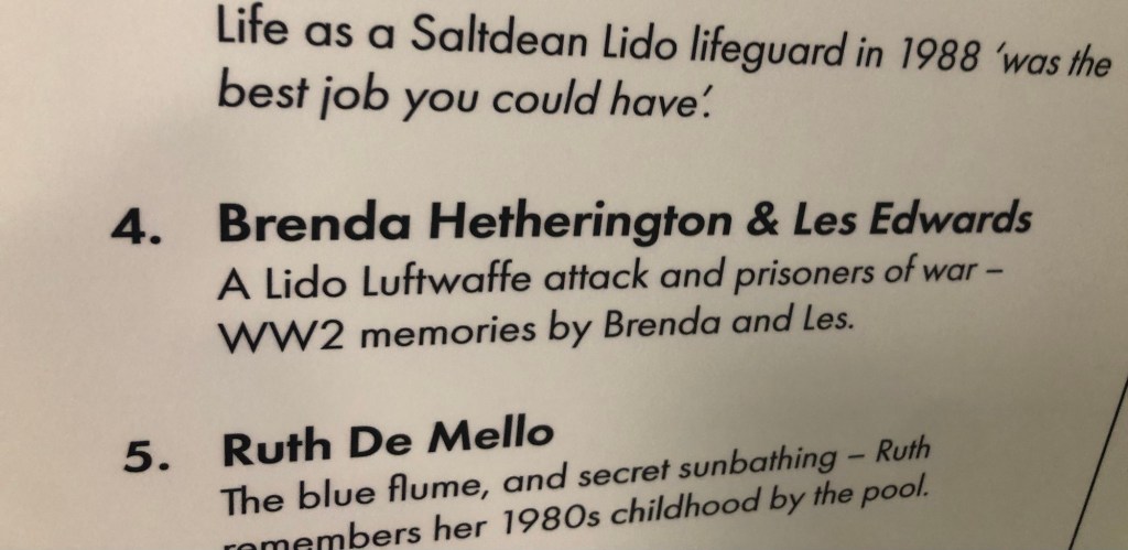 Sarah recently discovered that there’s oral history at Saltdean Lido on the English Channel where a Luftwaffe pilot was spotted firing down at the pool in WW2 on his way home. So we know that the bomber pilots flew low over southern England to hit final targets before finishing for the night.